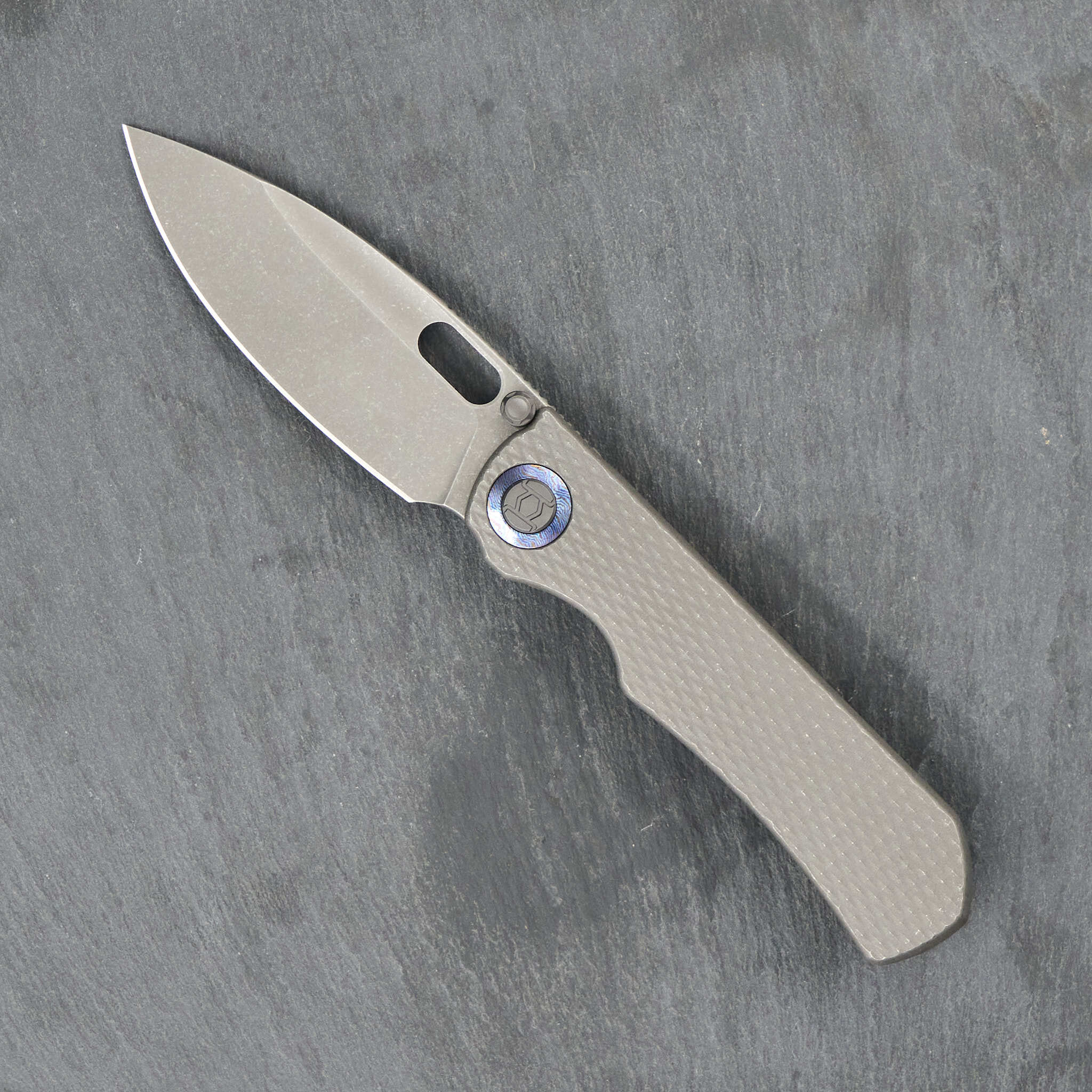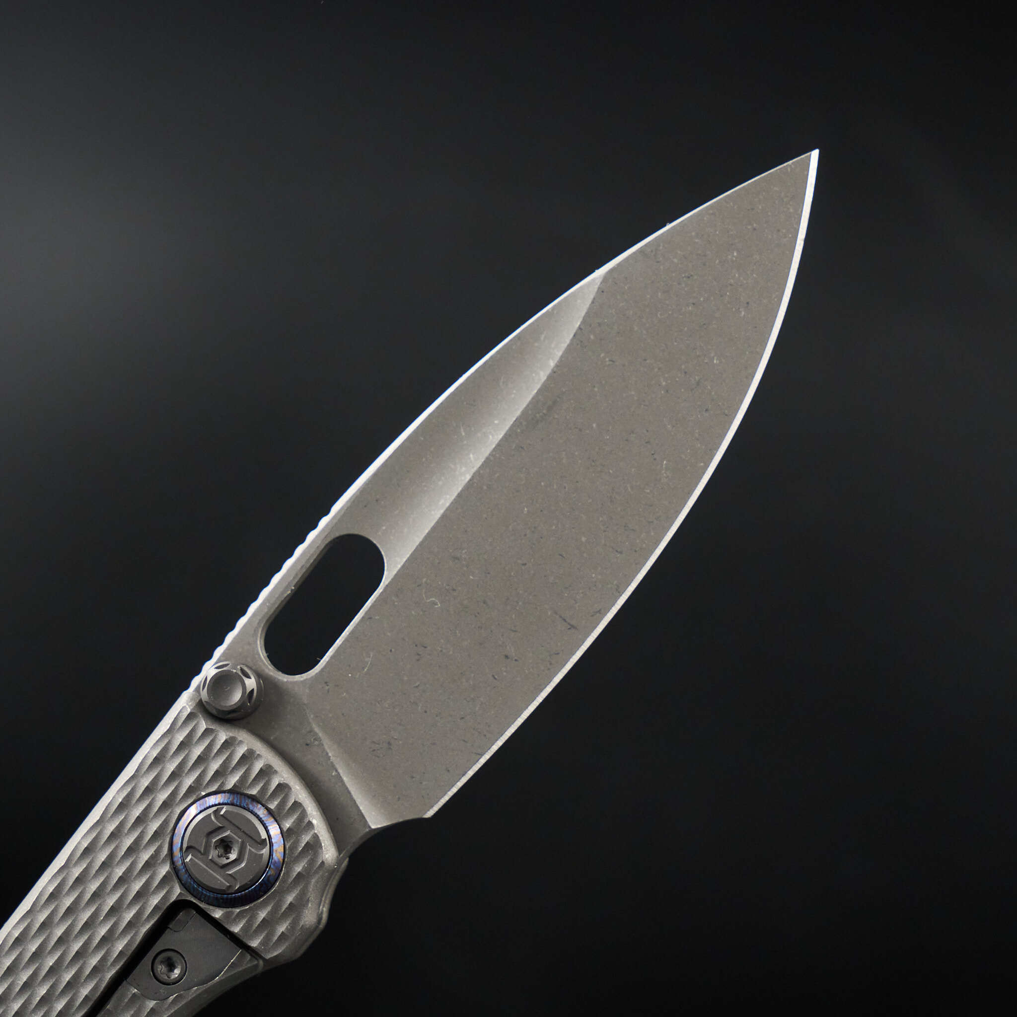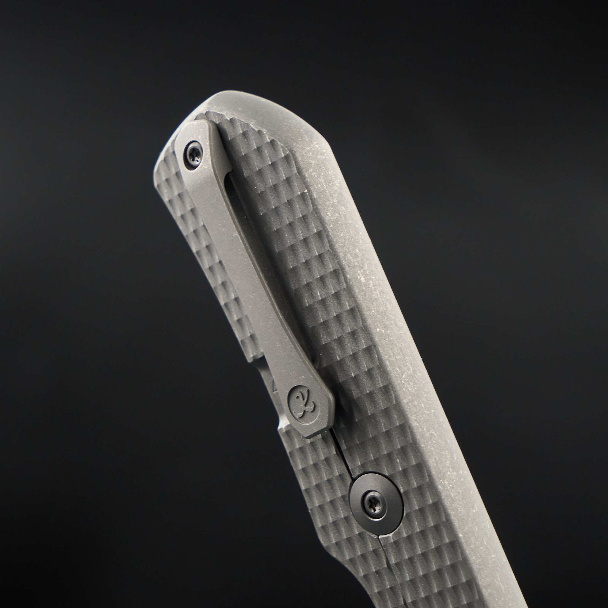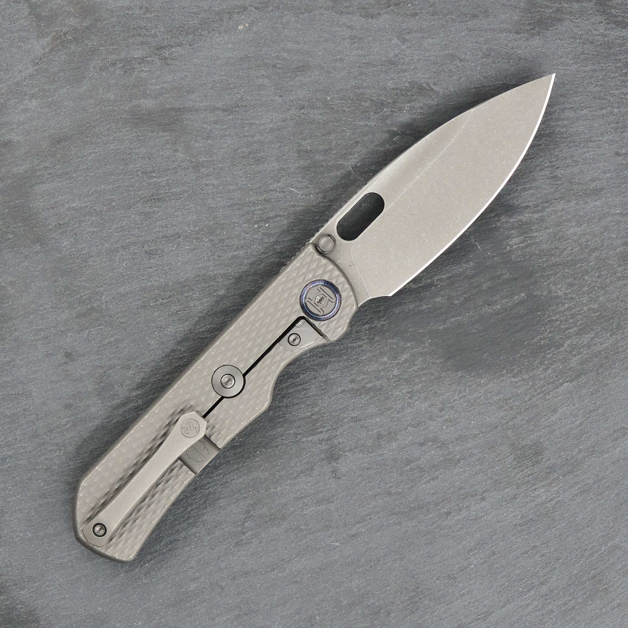 Осевой узел украшают кольца из тимаскуса – материала созданного из нескольких сплавов титана по технологии дамасской стали. Контрастируя с единым цветом ножа, они создают уникальный и запоминающийся внешний вид. Клипса также выполнена из тимаскуса и придаёт ножу необычный и премиальный внешний вид.