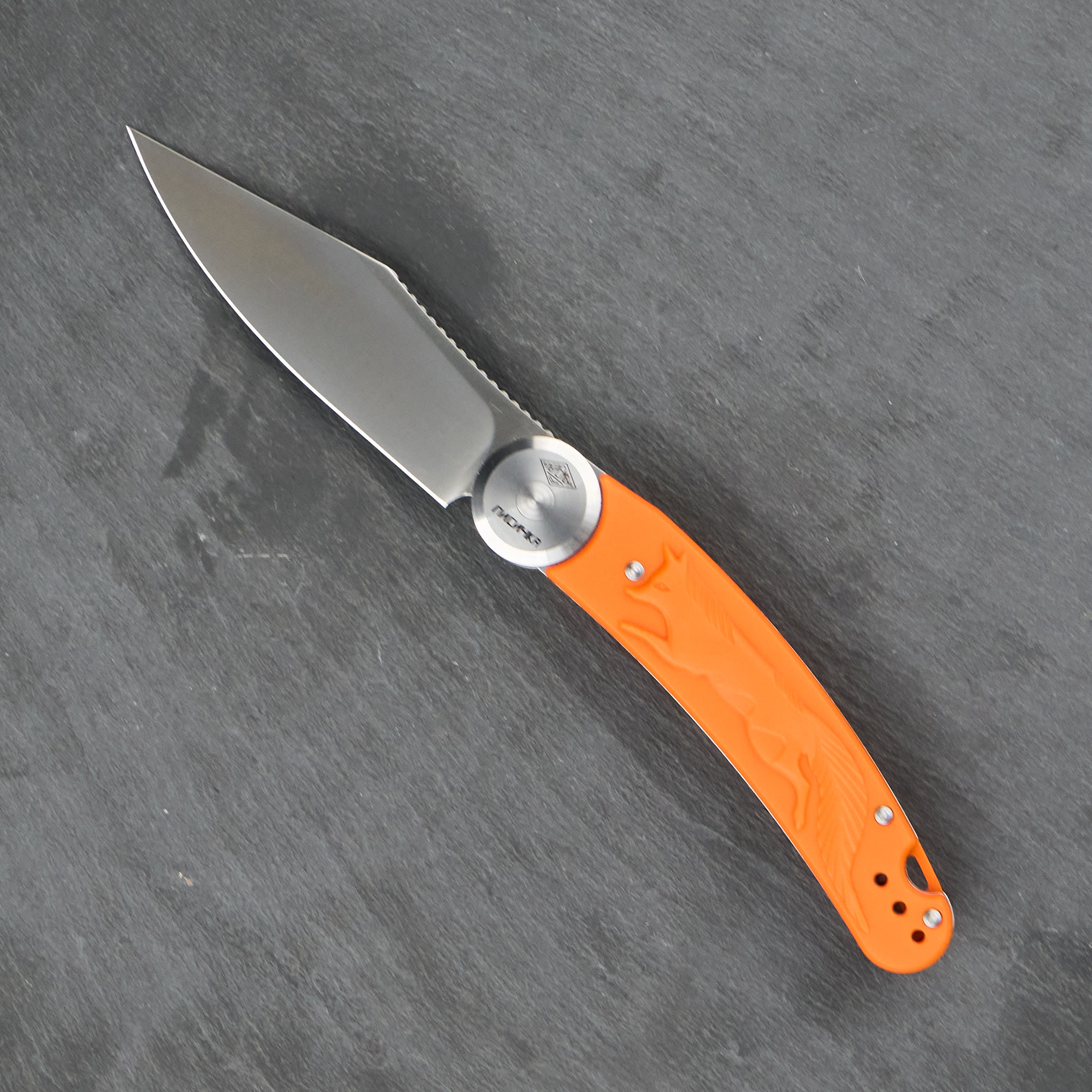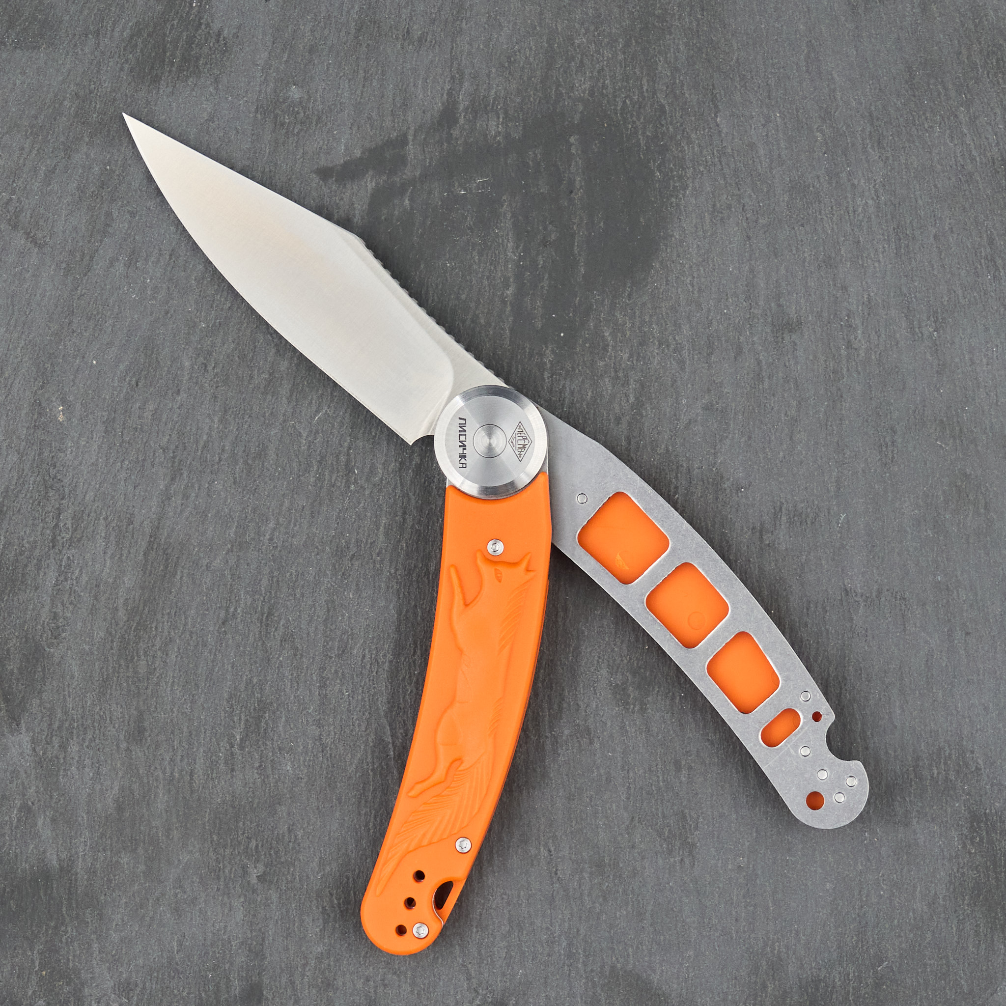 «Лисичка» имеет необычный рамный замок. Рукоять размыкается на две половины и вращается вокруг осевого узла. За счет штифта рукоять в открытом и закрытом положении становится практически фиксированной. Клинок не сможет непроизвольно открыться.